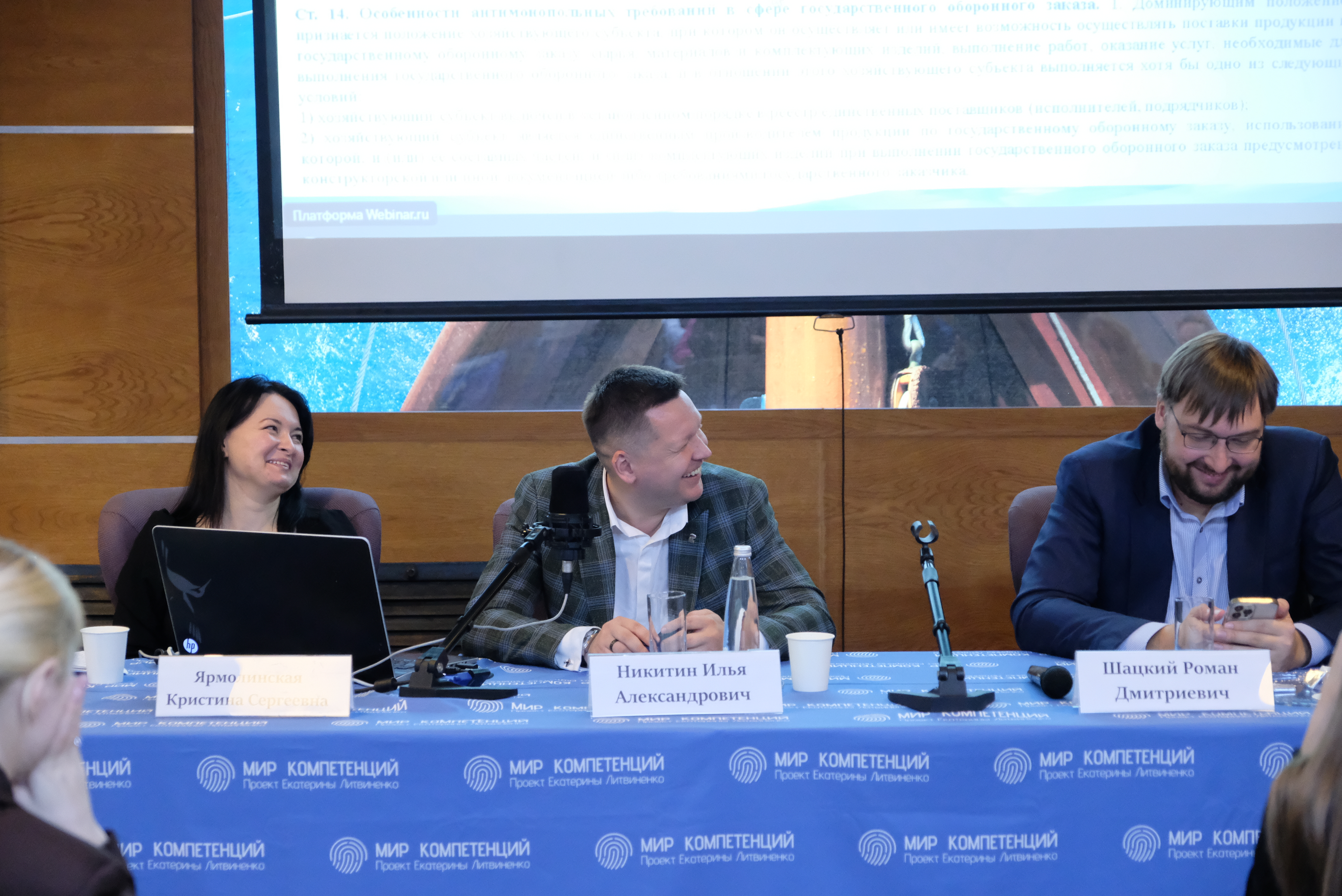 Модераторами и постоянными экспертами встречи выступили Н.А. Ермолаев, практик в области государственного регулирования цен на продукцию, поставляемую по ГОЗ, представитель предприятия крупнейшего концерна ОПК, экс-начальник 5 отдела Управления авиационной, ракетно-космической и атомной промышленности ФАС России; Р.Д. Шацкий, заместитель директора Департамента контрактно-договорной работы Госкорпорации Роскосмос, экс-заместитель начальника Управления сухопутного и морского вооружения, военной техники и связи ФАС России; К.С. Ярмолинская, руководитель планово-экономического отдела ведущей прибыльной организации ОПК, практик по взаимодействию с ВП МО РФ, Минобороны России, ФСБ России, Росгвардии и ведущими госкорпорациями.